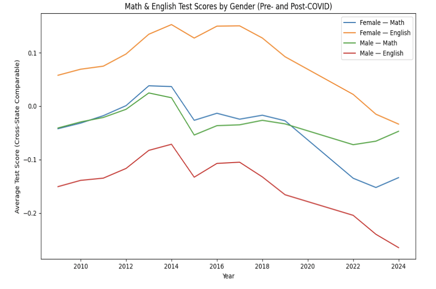Alternatively, we hypothesize that female students were more impacted by social disruption during the pandemic than male students. Specifically, Cholankeril et al. found that women experienced “significantly higher levels of anxiety than men” during the COVID-19 pandemic (Cholankeril et al.). We believe that the source of this anxiety was being stuck at home with distanced learning and the increased use of social media platforms by both genders, as according to Twenge et al., “associations between … digital media use and low psychological well-being were generally larger for girls than for boys” (Twenge et al.). Thus, we believe that because students were stuck at home and consumed digital media more than they had before the pandemic, this led to female students experiencing more negative mental health outcomes from consuming this media, and could ultimately explain the higher levels of anxiety and drop in test scores of female students during the pandemic.